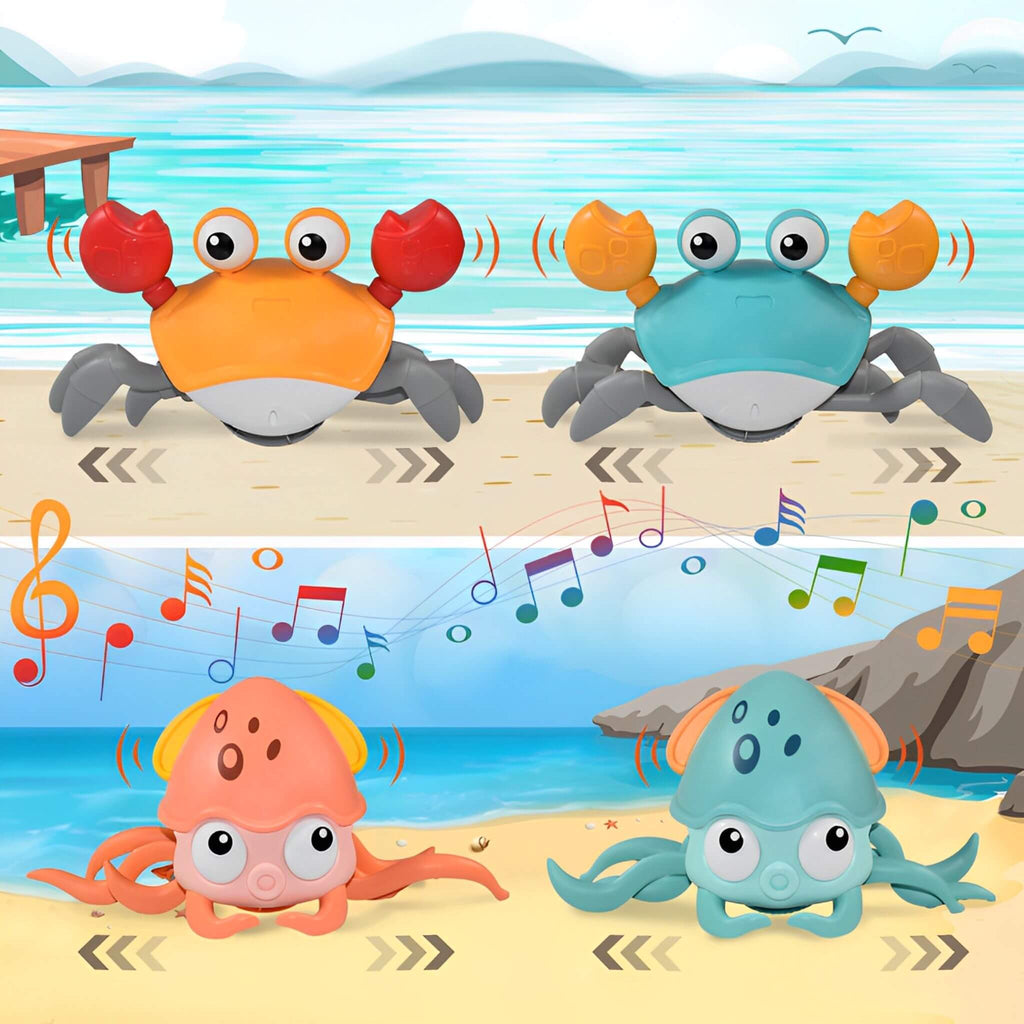 O caranguejo e polvo são brinquedos divertidos e inovadores que prenderá a atenção das crianças e deixá-las encantada com o brinquedo que se move em direções opostas quando detecta um obstáculo, graças ao seu exclusivo sensor.